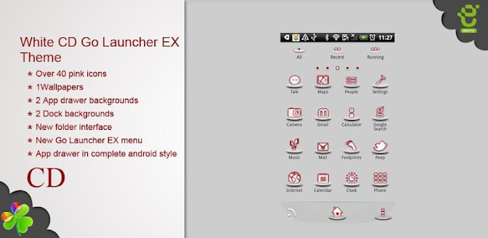 White CD theme GO Launcher EX is available now! Designed by Esuny Design! Over 40 New Line Style icons, 2 Dock background, new folder interface and app drawer. Download this theme and have a completely new style of your android phone.