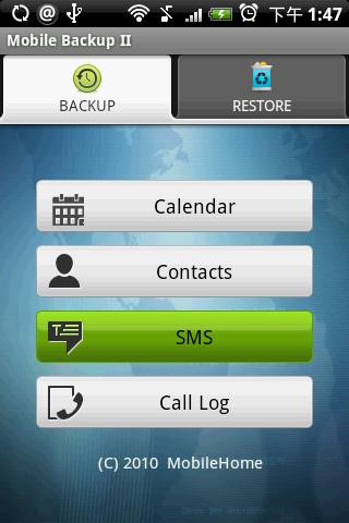 This App easily backup and restore your mobile data (Calendar, Contacts, SMS and Call Log) in SD card. The backup data is stored in the root directory of SD card.