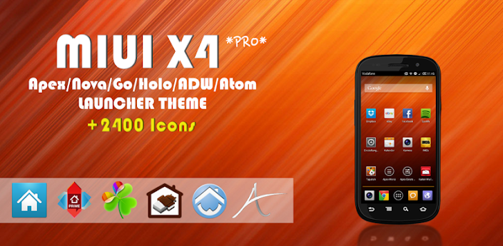 Overview: MIUI X4 Theme PRO/DONATE for Go Launcher Ex. The Icon Pack is also compatible with NOVA Launcher AND Apex Launcher