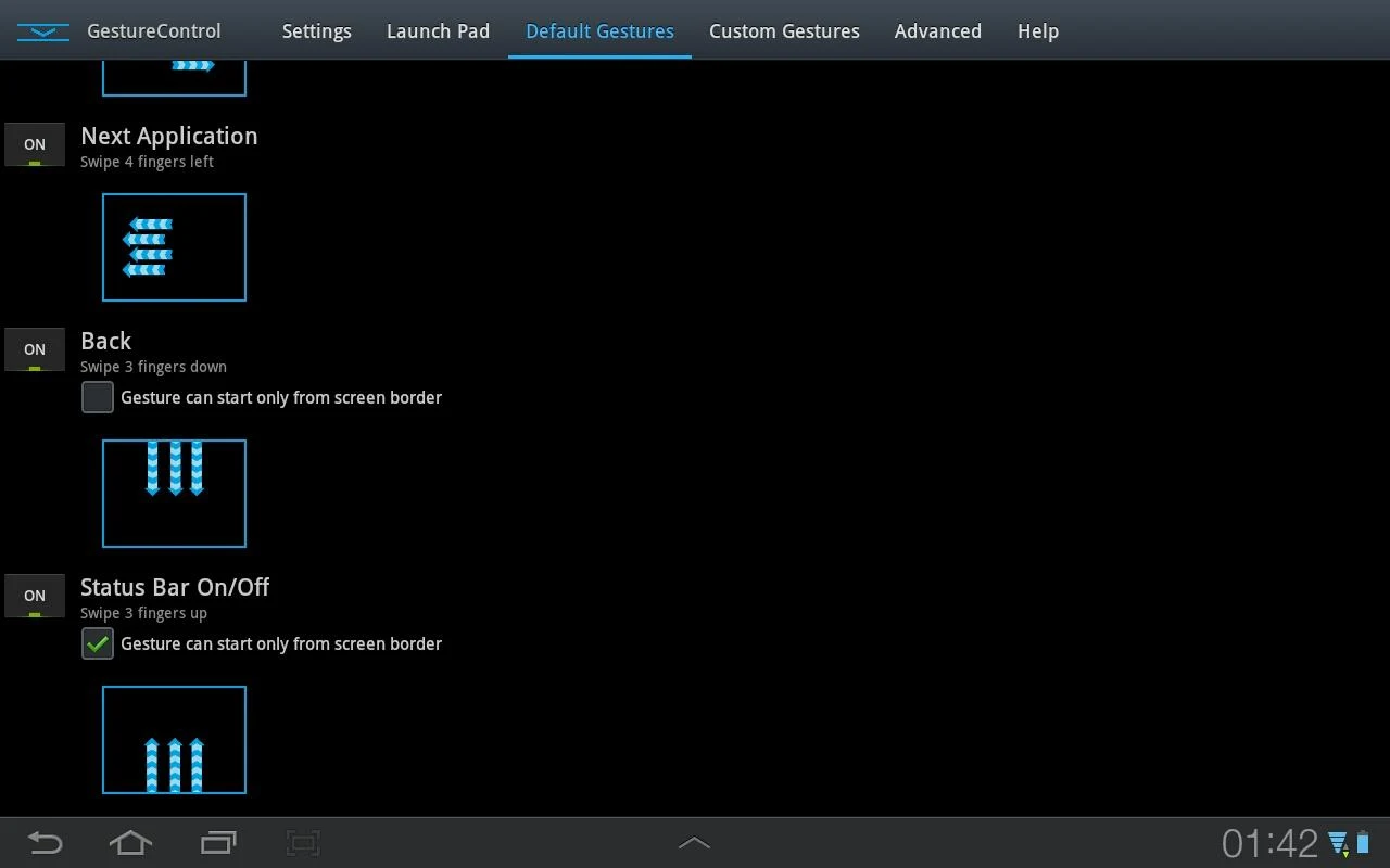 ★ Custom actions – LaunchPad, Start application, Previous Application, Next application, Home, Kill current application, Back, Forward, Recent application list, Recent application dialog, Menu, Notification Panel, Hide/Show status bar, Start launcher shorcut(bookmark, contacts, settings, etc), Start Tasker task, Pause gestures, Exit, Screen Off (lock), Alt+Tab, Music Play/Next/Previous, Volume, Search, Voice Search, Select Input Method.