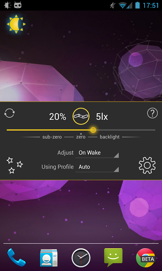 Lux provides the option to automatically adjust the backlight at fixed intervals (periodic mode), when a change in environment is detected (dynamic mode), or when the phone wakes from sleep. It’s also possible to adjust the backlight manually. Simply disable automatic mode and you can use it like a traditional brightness tool!