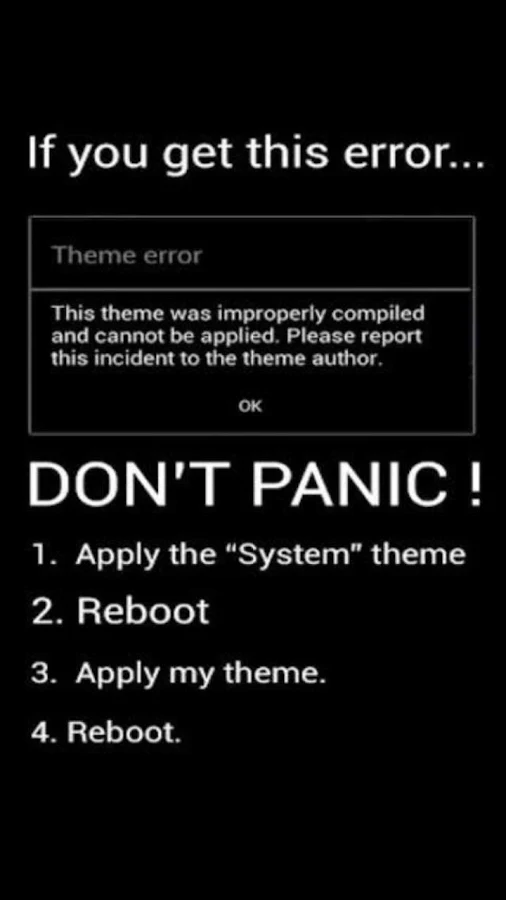 If you get this message “Theme is inproperly compiled error”. Solution: Set system theme, reboot your phone, set the downloaedd theme.