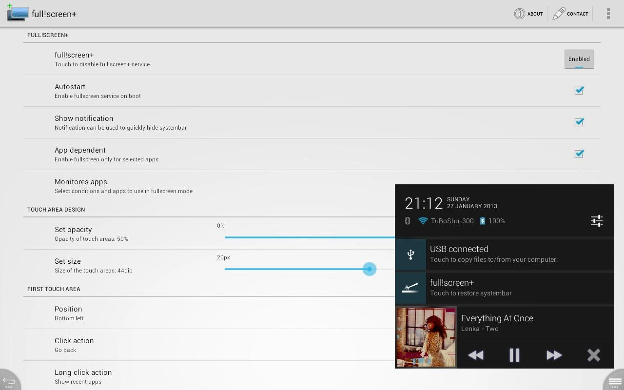 Automatically hide the systembar depending on currently active app. Use your tablet in fullscreen-mode without losing systembars main functions: navigation options and notifications .
