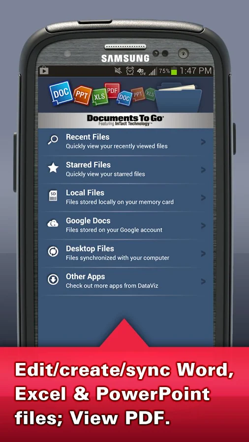 Overview: View native Microsoft Word, Excel and PowerPoint files & attachments with Documents To Go Main App. Supported file formats include .doc,. docx,. xls,. xlsx,. ppt,. pptx.