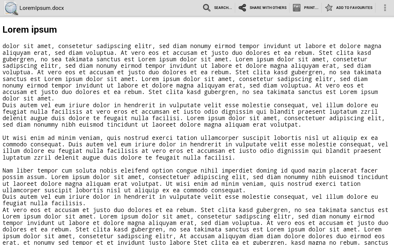 It allows opening office productivity application documents located in the filesystem, e.g. on sd card, as well downloaded documents, files on Dropbox, Box, or documents files attached to an email. It offers zooming in and out of documents, searching inside documents, copying text from documents as well as printing documents via Google Cloud Print. And it even offers reading text documents (.odt, .sxw, .docx) aloud via Android’s text-to-speech functionality.