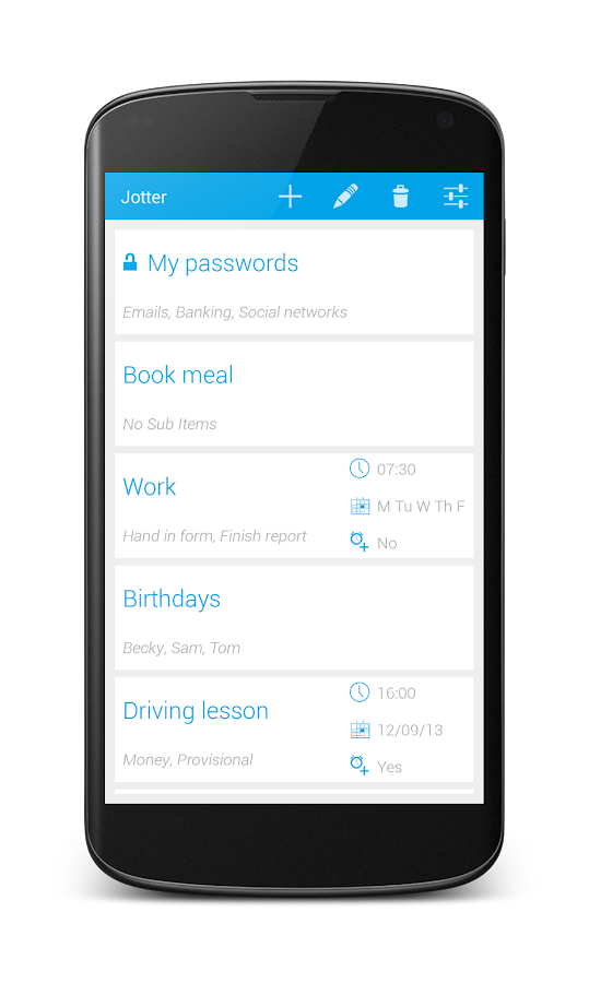By password protecting notes you will have to enter a password when deleting, editing or viewing sub notes of the item, this means Jotter is highly versatile by allowing to enter not just notes but also information you want for your eyes only.