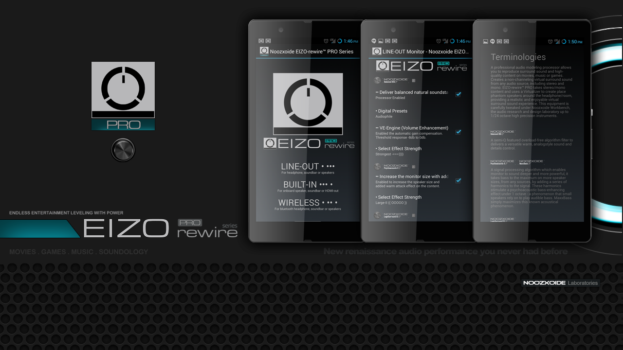 Noozxoide EIZO-rewire™ PRO takes stereo content and uses a virtualizer to create place phantom speakers around the headphone/room, providing a realistic and enjoyable virtual surround sound experience. This equipment is carefully tweaked under “Noozxoide Workbench”, the audio research and design laboratory up to 1/24 octave high precision instruments.