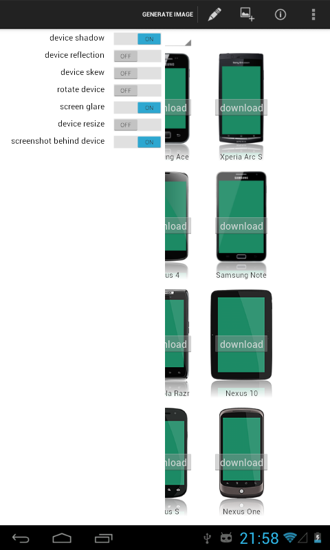In short, this application allows to connect 2 images: screenshot and smartphone image, the result is image ready to post on website or blog.