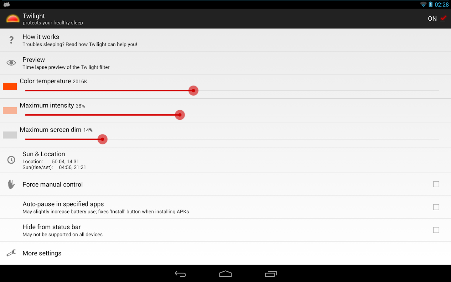 The Twilight app makes your device screen adapt to the time of the day. It filters the blue spectrum on your phone or tablet after sunset and protects your eyes with a soft and pleasant red filter. The filter intensity is smoothly adjusted to the sun cycle based on your local sunset and sunrise times.