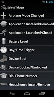 Airplane Mode Enabled/Disabled, App Installed/Removed, App Opened/Closed, Battery Level, Bluetooth Event, Day/Time, Device Boot, Device Docked/Undocked, Dial Phone Number, Headphones Inserted/Removed, Location Trigger, Media Button Press, Mobile Service Status, NFC Tag, Power Button Toggle, Power Connected/Removed, Regular Interval, Screen On/Off, Shake Device, SMS Received, SMS Sent, Widget Button Press, Wifi State Change.