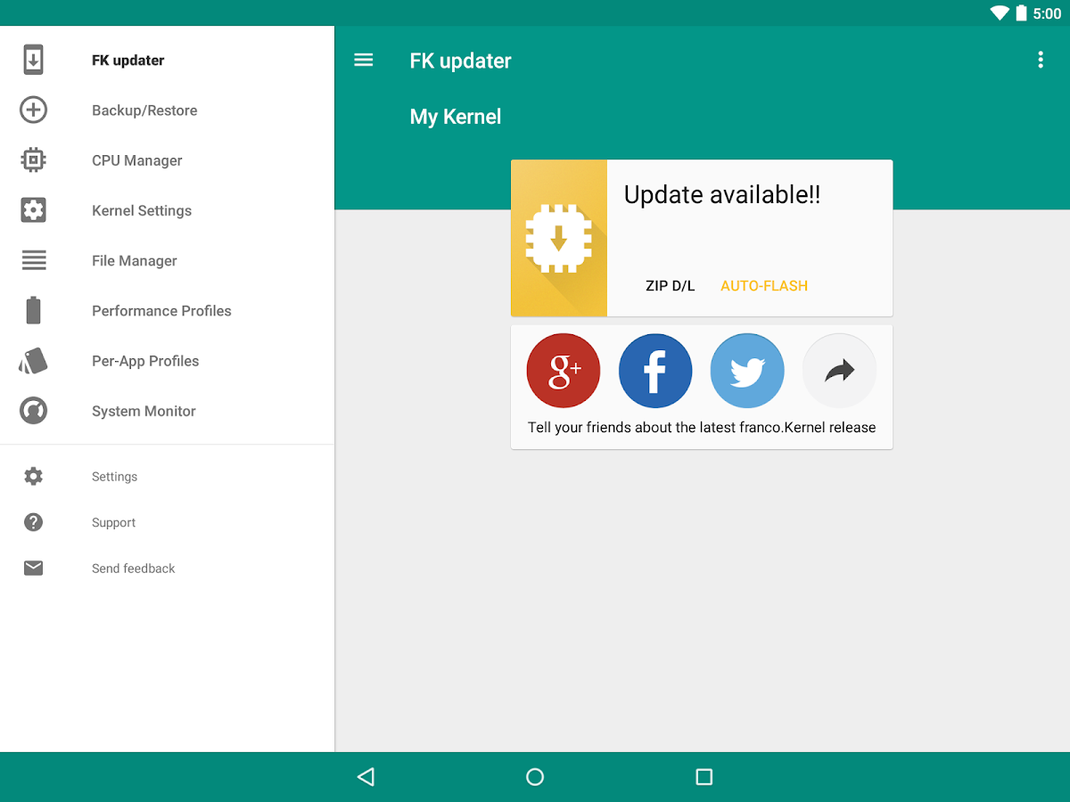 franco.Kernel updater v12p399 Requirements: 4.0+, Lucky Patcher Or Modified Google Play Store. Overview: A well established top-100 paid app with one of the highest ratings in the Play Store! [break] With a beautiful and very easy-to-use UI, combines a series of powerful tools to manage and control your device with franco.Kernel. It's simply the best tool of its kind - managing the Kernel parameters has never been more fun and easy! Take note that your device needs to be ROOTED.